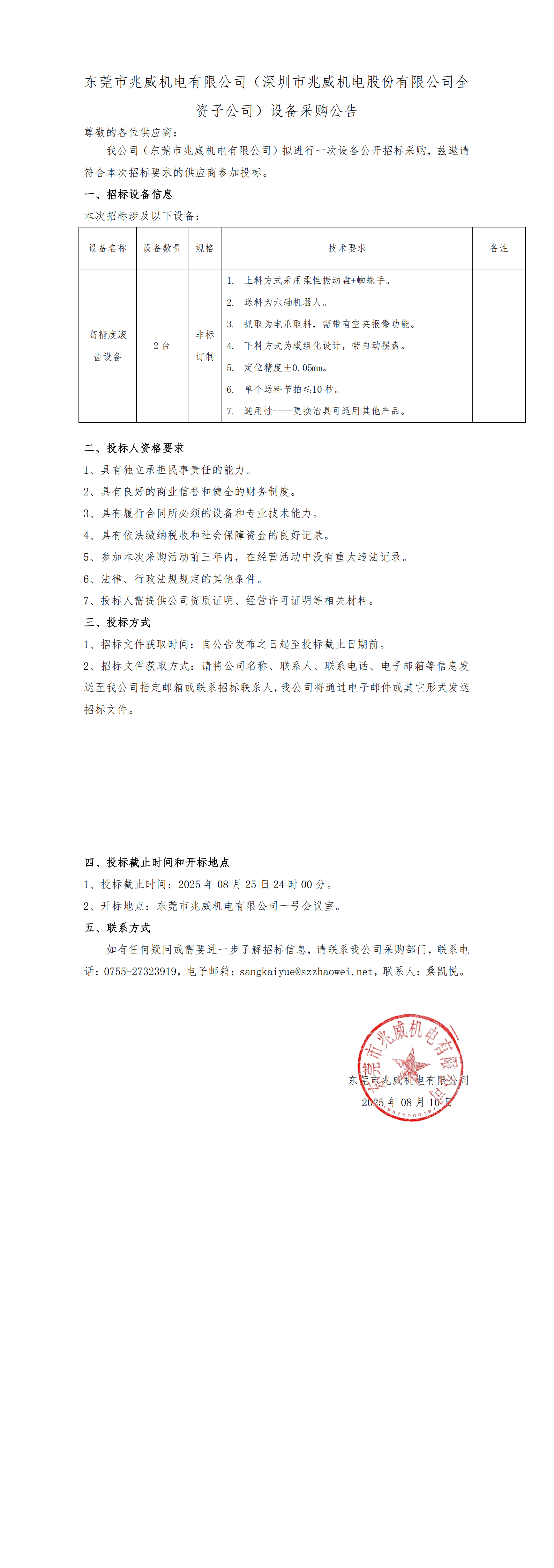 东莞市兆威机电有限公司滚齿机设备采购公告 2025-08-10 11:00 相关推荐 2021年宝博会展台设计方案评审结果 2021中国国际信息展览会展台设计方案评审结果 设备采购招标公告 建设“深圳市智能机器人微型驱动控制系统工程研究中心”设备采购公告 东莞市兆威机电有限公司设备采购公告 东莞市兆威机电有限公司自动化设备采购公告 上一篇 东莞市兆威机电有限公司自动化设备采购公告 下一篇 东莞市兆威机电有限公司设备采购公告 推荐方案 电动自行车电子避震器微型齿轮箱解决方案 医疗胰岛素注射笔驱动系统应用 汽车空调出风口调节执行器应用 割草机器人电动滚筒执行器应用 电动夹爪驱动系统应用 最新动态 载誉前行!兆威机电斩获第八届广东省政府质量奖 二十四载深耕微型驱动,兆威机电以创新绘就微型驱动新蓝图 “聚力价值·兆就威来”兆威机电2025年迎新春暨颁奖盛典圆满结束 兆威机电荣获“2024深圳机器人年度评选”双奖,赋能行业技术创新 兆威机电灵巧手亮相CES 2025,开启机器人技术新纪元 在线留言 MESSAGES 公司名(*): 姓名(*): 电话(*): 微信号: 详细需求: 验证码: × 7 = 28